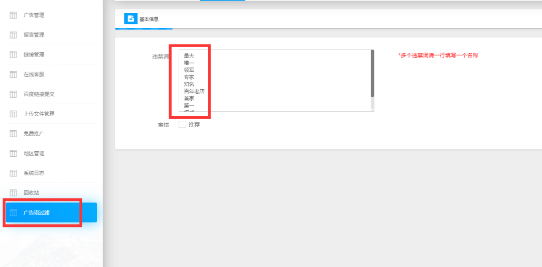 廣告法規(guī)定越來越嚴格,廣告詞成了企業(yè)的不敢碰觸的“炸彈”。對此,此次“萬家燈火CMS系統(tǒng)”的升級,可在編輯框中自定義自己領域中的違禁詞,讓網站遠離“危險”更安全。