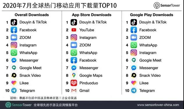 據(jù)Sensor Tower商店情報數(shù)據(jù)顯示,2020年7月,抖音及海外版TikTok以超過6520萬次下載量,繼續(xù)位列*移動應(yīng)用(非游戲)下載榜*。