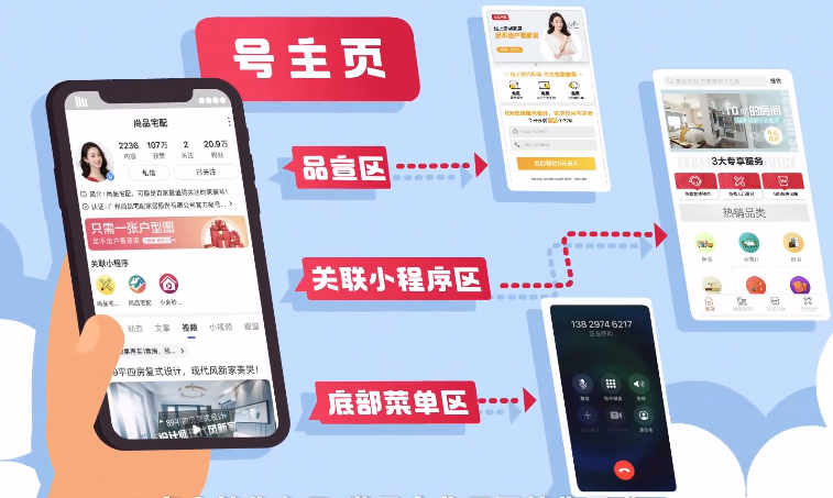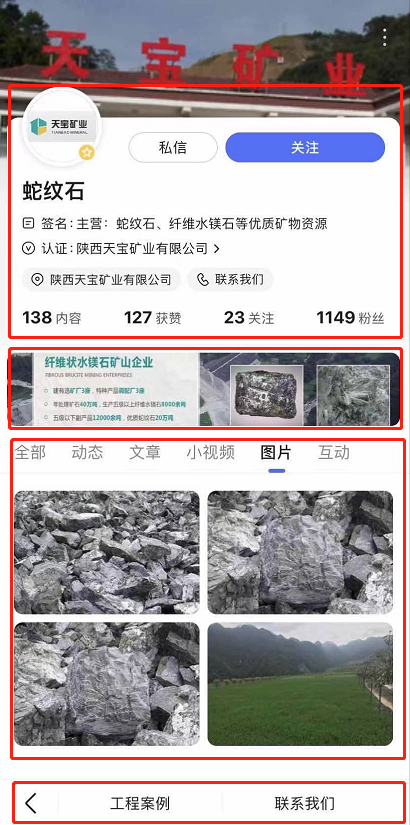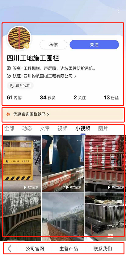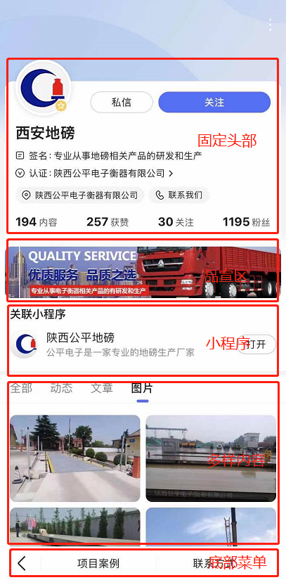企業(yè)百家號主頁分5大模塊:固定頭部、品宣區(qū)、小程序、多樣內(nèi)容、底部菜單。